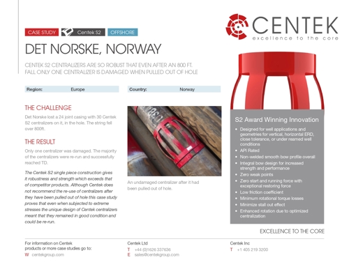 The Centek S2 single piece construction gives it robustness and strength which exceeds that of many competitor products. Although Centek does not recommend the re-use of centralizers when POOH this case study proves that even when subjected to extreme stresses the unique design of Centek centralizers meant that they remained in good condition and could be used repeatedly.