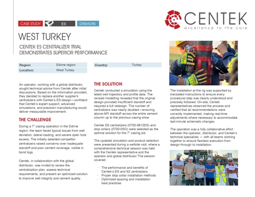 During a 7” casing operation in the Edirne region in West Turkey, the team faced typical issues from well deviation, lateral loading, and severe open hole excess. The initially selected competitor centralizers raised concerns over inadequate standoff and poor cement coverage, visible in bond logs. Centek, in collaboration with the global distributor, was invited to review the centralization plan, assess technical requirements, and present an optimized solution to improve well integrity and cement quality.