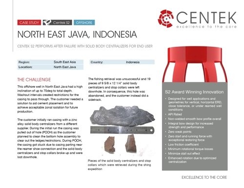 Simulations run by Centek using their propriety Latload software showed that the S2 provided the required standoff and better flow by area compared to the solid body centralizers. Using the correct type of centralizer, the Centek single piece, bow spring, the customer achieved a good cement job, with no failures.