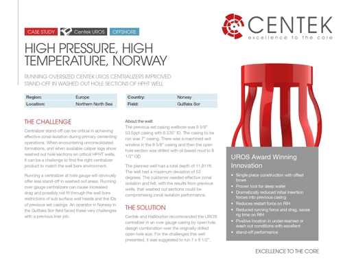 Running a centralizer at hole gauge will obviously offer less stand-off in washed out areas. Running over gauge centralizers can cause increased drag and possibly not fit through the well bore restrictions of sub surface well heads and the IDs of previous set casings. An operator in Norway in the Gullfaks Sor field faced these very challenges with a previous liner job.