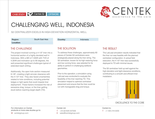 To address these challenges, approximately 60 pieces of Centek S2 centralizers were strategically placed along the liner string. The S2 centralizer, known for its high restoring force and low running force, was selected for its ability to perform in challenging wellbore geometries. Prior to the operation, a simulation using LatLoad was conducted to evaluate the feasibility of the liner reaching TD. This simulation helped to optimize centralizer placement and ensure that the liner could be run with manageable drag and torque.