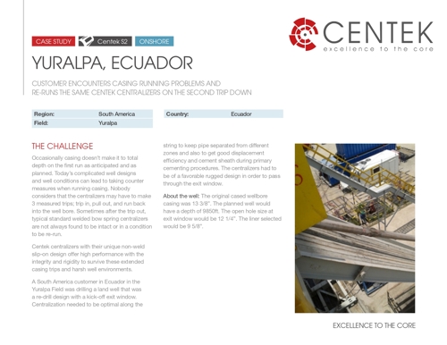 A South America customer in Ecuador in the Yuralpa Field was drilling a land well that was a re-drill design with a kick-off exit window. Centralization needed to be optimal along the string to keep pipe separated from different zones and also to get good displacement efficiency and cement sheath during primary cementing procedures. The centralizers had to be of a favorable rugged design in order to pass through the exit window.