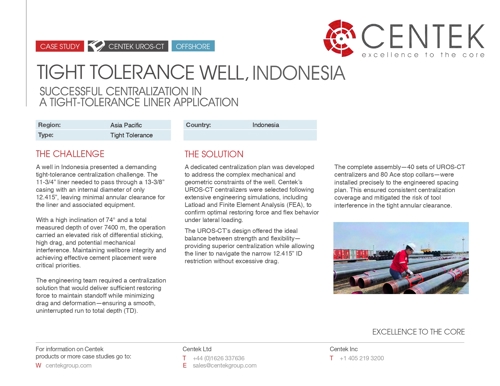 A well in Indonesia presented a demanding tight-tolerance centralization challenge. The 11-3/4” liner needed to pass through a 13-3/8” casing with an internal diameter of only 12.415”, leaving minimal annular clearance for the liner and associated equipment. With a high inclination of 74° and a total measured depth of over 7400 m, the operation carried an elevated risk of differential sticking, high drag, and potential mechanical interference. Maintaining wellbore integrity and achieving effective cement placement were critical priorities. The engineering team required a centralization solution that would deliver sufficient restoring force to maintain standoff while minimizing drag and deformation—ensuring a smooth, uninterrupted run to total depth (TD).