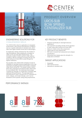The UROS-SUB centralizer is designed to be run in the close tolerance, under-ream applications found in some of the world’s most challenging deepwater wells.