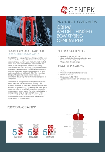 Featuring heat-treated, spring-steel bows welded to rigid high-strength end bands, it ensures optimized stand-off and casing centralization. Centek's proprietary metallurgy and heat-treatment process enhance the OBH-W's strength and flexibility, minimizing start and running forces to ease casing installation to total depth (TD). This innovative design undergoes rigorous in-house testing to consistently deliver superior performance compared to competitors.