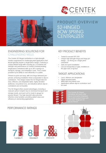The Centek S-H Hinged centralizer is a high-strength solution engineered for challenging well applications that would typically require a single-piece design.