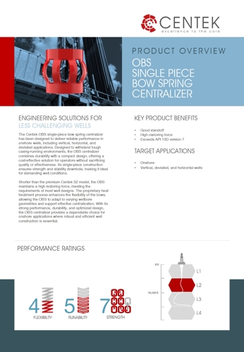 Shorter than the premium Centek S2 model, the OBS maintains a high restoring force, meeting the requirements of most well designs. The proprietary heat treatment process enhances the flexibility of the bows, allowing the OBS to adapt to varying wellbore geometries and support effective centralization. With its strong performance, durability, and optimized design, the OBS centralizer provides a dependable choice for onshore applications where robust and efficient well construction is essential.