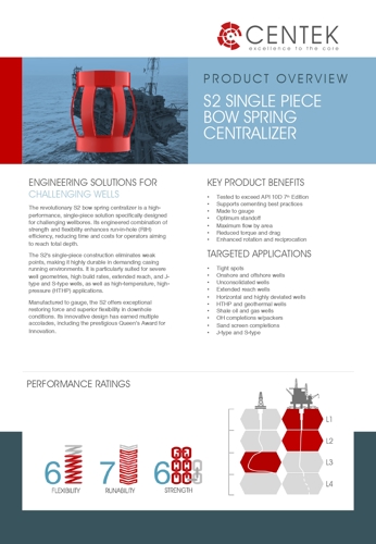 Engineered for both high strength and flexibility, the patented S2 is a premium single piece bow spring centralizer developed for challenging wellbores.