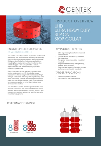 The Centek UHD Stop Collar is engineered for the most demanding well environments, delivering exceptionally high holding forces where reliability is non-negotiable. Designed specifically for challenging applications — including flush casing joints, where traditional stop collars struggle — the UHD provides a robust, dependable solution without requiring specialist installation procedures.